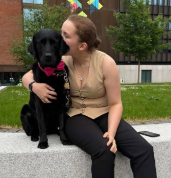 This is Caitlin and Honey. Caitlin is graduating in this set of ceremonies with her BSc in Sport and Exercise Therapy. Honey is her guide dog who has been with her every step of the way. Caitlin was born with a progressive eye condition called Congenital Glaucoma and Honey has attended sessions with Caitlin for the past 3 years.
